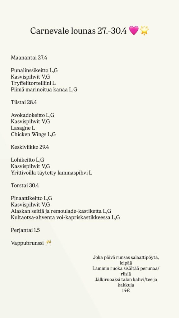 Aukioloajat: Ma 10:30 – 15:00 Ti 10:30 – 15:00 Ke 10:30 – 15:00 To 10:30 – 15:00 Pe 10:30 – 15:00 La 10:30 – 15:00 Su Suljettu